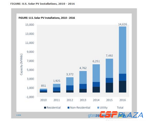 根據GTM Research和太陽能工業協會(SEIA)發表的最新數據顯示,2015年至2016年,美國太陽能市場增幅達95%,裝機量高達14.6GW。2016年是美國太陽能市場標志性的一年。