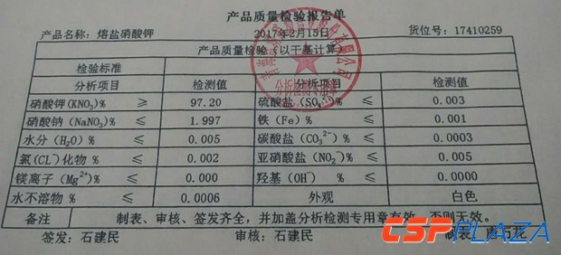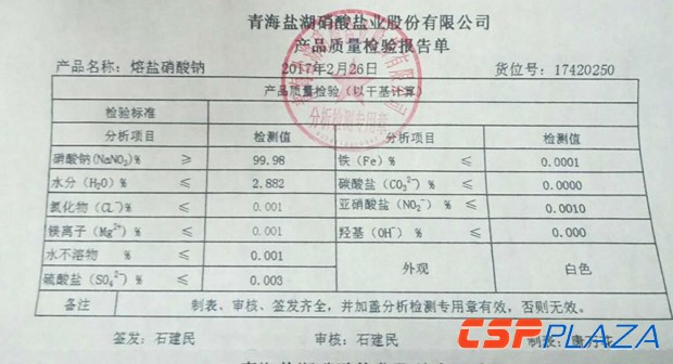 附:青海鹽湖硝酸鹽業股份有限公司熔鹽產品質檢單