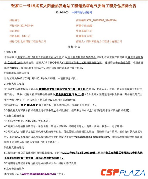 CSPPLAZA光熱發電網訊:近日,張家口一號15MW塔式太陽能熱發電工程儲熱塔電氣安裝工程開始招標,并對投標人資格提出了如下要求:
