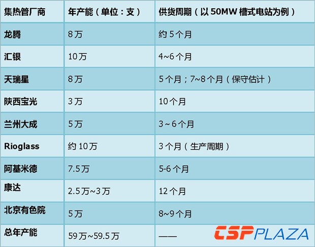 據CSPPLAZA記者了解,當前各主要集熱管廠商的產能情況分別為(以下數據由對應廠商提供,未經實地調研):