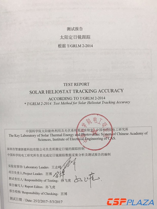 2016年10月,深圳智康與中科院電工所達成產品測試合作相關協議,并開始產品生產、安裝、調試。2017年2月14日按照GRLMFDTS-002-2014《太陽定日鏡跟蹤準確度測量方法》開始預測試,并于2017年2月25日、2月26日,3月4日、3月5日進行為期四天的正式測試。2017年3月20日中科院電工研究所形成了正式的測試報告:各項指標優于相關標準(見附件)。