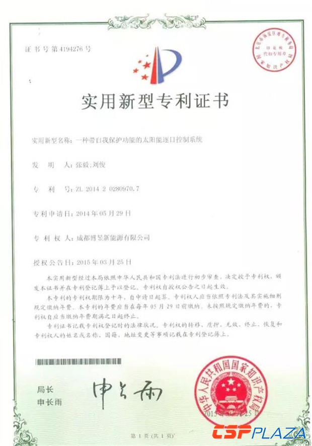 2017年4月19日,博昱新能擁有自主知識產權的太陽能跟蹤控制產品通過CE認證,獲得證書。該產品是太陽島的核心部件,用于槽式鏡場和塔式鏡場的跟蹤控制。在槽式應用領域,該產品已經在博昱德令哈實驗回路的實際工況中穩定運行了2年以上。在塔式應用領域,該產品已經在宿遷光電中心塔式項目上穩定運行近一年。