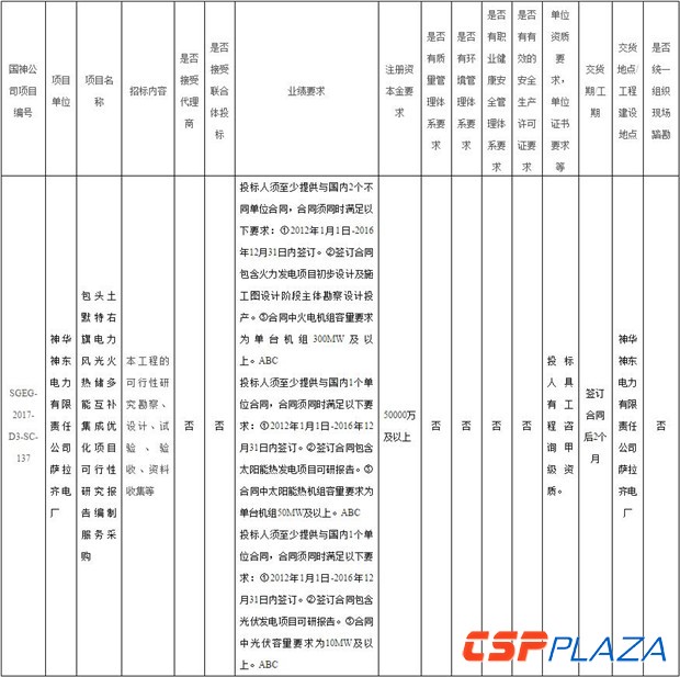 CSPPLAZA光熱發電網訊:近日,神華國神集團有限公司委托中國神華國際工程有限公司發布了招標公告,將針對下屬公司神華神東電力有限責任公司薩拉齊電廠所開發的包頭土默特右旗電力風光火熱儲多能互補集成優化項目的可行性研究報告編制服務采購進行公開招標,其中含100MWt槽式光熱集熱系統。購買標書時間截止到2017年5月2日,遞交投標文件截止時間同開標時間均為2017年5月15日上午10:00。