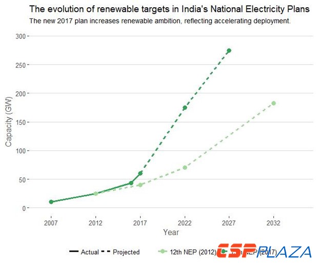 該草案預測,印度不僅能實現2022年目標,而且到2027年,可再生能源發電裝機將達到275吉瓦。這是2012電力規劃預測產能的三倍,比印度公開宣布的目標更具雄心。
