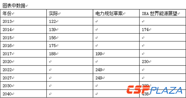 圖例:黑色實線為現實數據,黑色虛線為預測值,淡綠色為十二五規劃(2012)中設定的目標,深綠色為十三五電力規劃(2017)中設定的目標。