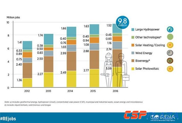 報告顯示,截止到2016年底全球可再生能源行業從業人數達到980萬人,幾乎是2012年的兩倍。可再生能源從業人數在2012年前約為500萬人,2016年從業人數約達到980萬人,增長了約480萬人。