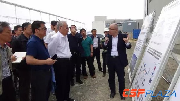 調研組聽取了項目負責人的匯報講解并登上常規島四樓觀光平臺縱覽項目全局。張基堯副主任作為中國電力行業的老領導和老專家,對該項目以光熱為突破口,同時實現清潔發電、廉價大規模儲能、棄風棄光的消納、冬季大棚供熱、居民供暖和環境保護的方案給予認可和鼓勵,對將太陽能綜合開發利用與新型城鎮化及“精準扶貧”戰略相結合,打造華強零碳特色小鎮及能源、農業并重的新型農村發展模式產生了濃厚的興趣,在幾個關鍵環節上提出問題并和大家一起熱烈地討論。