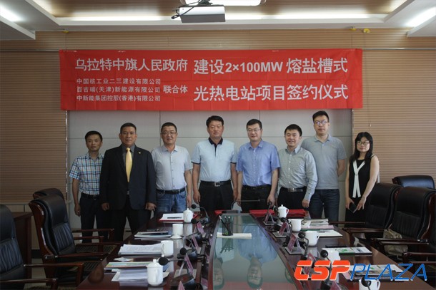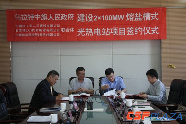 CSPPLAZA光熱發電網訊:6月 1日上午,由中國核工業二三建設有限公司(簡稱中核二三)、百吉瑞(天津)新能源有限公司(簡稱百吉瑞)與中新能集團控股(香港)有限公司(簡稱中新能)三方組成的聯合體與烏拉特中旗人民政府簽署了關于在烏拉特中旗建設2×100MW熔鹽槽式光熱發電項目的合作開發框架協議。