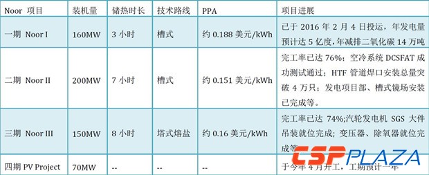 如圖所示,160MW的NoorI槽式光熱電站(3小時儲熱時長)已于2016年2月4日投運,電價為1.62迪拉姆/kWh,約合1.183人民幣/kWh;200MW的NoorII槽式光熱電站(7小時儲熱時長)的完工率已達76%;150MW的NoorIII塔式熔鹽光熱電站(8小時儲熱時長)的完工率也已達74%;今年4月,該項目第四階段(最后階段)的70MWNoorQuarzazateIV光伏電站正式動工,這標志著全部電站項目進入建設階段。