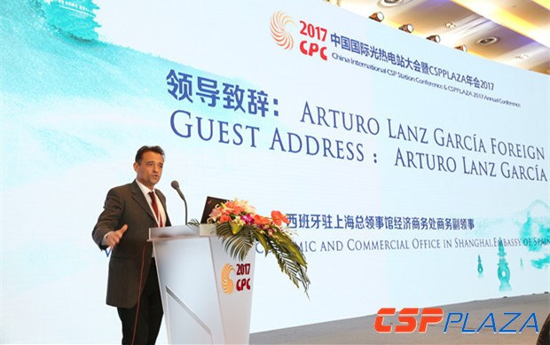 CSPPLAZA光熱發電網訊:中國光熱發電行業最大規模、層次最高的國際性年度盛會中國國際光熱電站大會暨CSPPLAZA年會2017(CPC2017)于2017年6月14~16日在杭州召開。西班牙駐上海總領事館經濟商務處副領事Arturo Lanz García作為外方代表致辭,回顧了中國在過去幾年發生的能源結構改革以及近年來中國太陽能發電事業的快速發展。隨著政府扶持政策的相繼出臺,中國在光熱發電領域快速崛起,與南非、智利、摩洛哥等地并肩成為新興光熱市場。而西班牙這個曾經的光熱巨頭,盡管國內的項目幾乎未再推進,但該國卻擁有世界上最成熟的大型光熱項目建設經驗和穩健的技術成果。