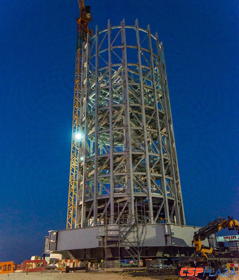 CSPPLAZA光熱發電網訊:7月初,以色列裝機121MW的Ashalim1塔式光熱電站完成吸熱器吊裝,因該電站的吸熱塔高達240多米,整個吸熱器的重量重達幾千噸,吸熱器的吊裝難度較大,項目團隊最終成功完成了該吸熱器的整體吊裝工作,成為該項目建設過程中的里程碑。