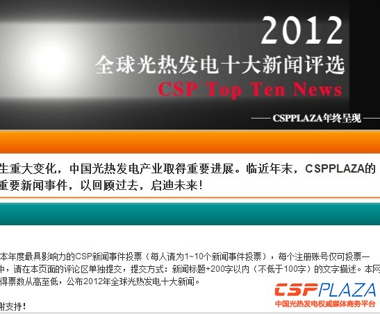 2012年即將過去,這一年,全球太陽能熱發電市場發生重大變化,中國光熱發電產業取得重要進展。臨近年末,CSPPLAZA的小編們與廣大CSPPLAZA網友一起梳理本年度發生的重要新聞事件,以回顧過去,啟迪未來! ... ... ... ...