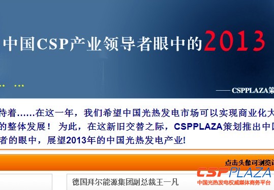 慧眼啟迪未來!臨近年末,CSPPLAZA策劃推出中國CSP產業領導者眼中的2013新聞專題,從領導者的眼中,展望2013年的中國光熱發電產業! ... ...