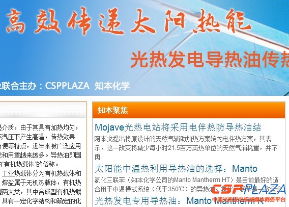 由國產導熱油領先廠商江蘇知本化學有限公司(以下簡稱“知本化學”)和CSPPLAZA共同策劃、聯合主辦的“高效傳遞太陽熱能——光熱發電導熱油傳熱的最佳選擇”專題報道 ... ... ... ... ... ... ... ... ... ...