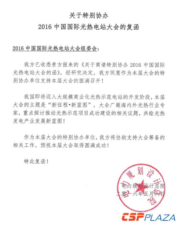 中國國際光熱電站大會暨CSPPLAZA年會(CPC2016)日前獲得電力規劃設計總院(簡稱電規總院)的特別協辦支持,電規總院在《關于同意協辦中國國際光熱電站大會2015的復函》中表示,“作為本屆大會的協辦支持單位,我方 ...