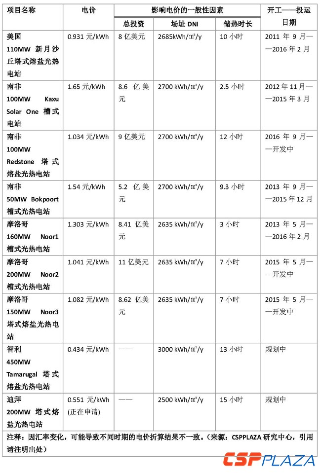 世界幾大代表性光熱電站的電價統計