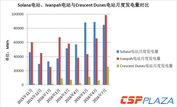 為了更清晰地呈現兩大電站的發電能力,CSPPLAZA對其月發電量進行了統計,如上圖可見,從2014年1月到2015年11月這23個月,Solana電站的最大月發電量為2015年8月的91475MWh,Ivanpah電站的月最大發電量是在2015年6月的 ...