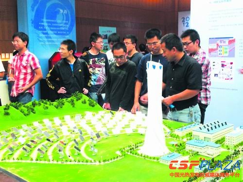 圖為青年學生正在參觀中科院電工研究所八達嶺太陽能熱發電試驗站模型,聆聽該所講解人員王疆偉講解發電站的工作運行原理。