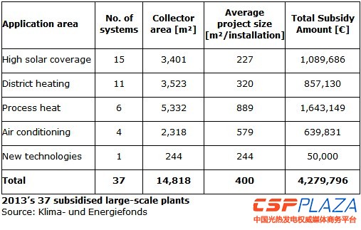 該筆支持通過奧地利氣候和能源基金發放,37個系統的總采光面積達到14800平方米,其中最大一筆補助款約160萬歐元被6個太陽能工業熱利用系統獲得,總集熱面積5300平方米。 ... ... ... ... ...