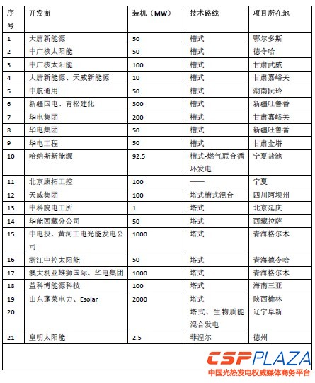 中國太陽能熱發電項目統計表