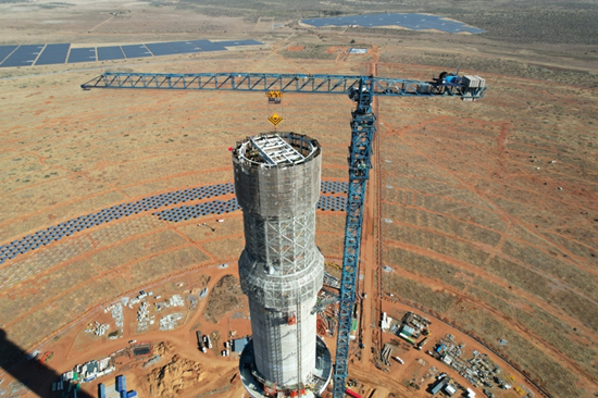 6月6日下午,隨著+247.04m頂層平臺吊裝就位,山東電建三公司南非紅石光熱項目光塔上部鋼結構順利封頂,至此光塔施工順利到頂。南非紅石光熱項目光塔上部鋼結構主框架為16個軸線的環形鋼結構,鋼結構總高35.95m,頂部標高+247.55m,