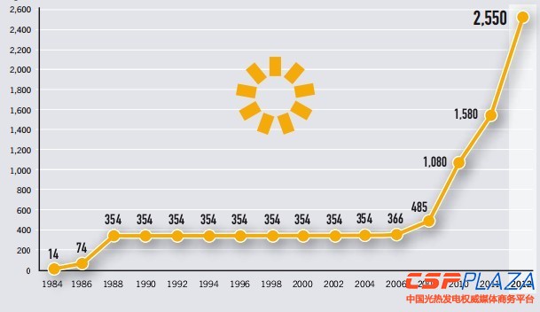 截至2012年底,全球光熱發電在運裝機約2550MW,其中超過3/4的裝機位于西班牙,約1950MW,美國2012年新增裝機為零,總裝機量仍為507MW。自2007年底到2012年,全球光熱發電裝機以年增長率43%的速度增長。 ... ... ... ...
